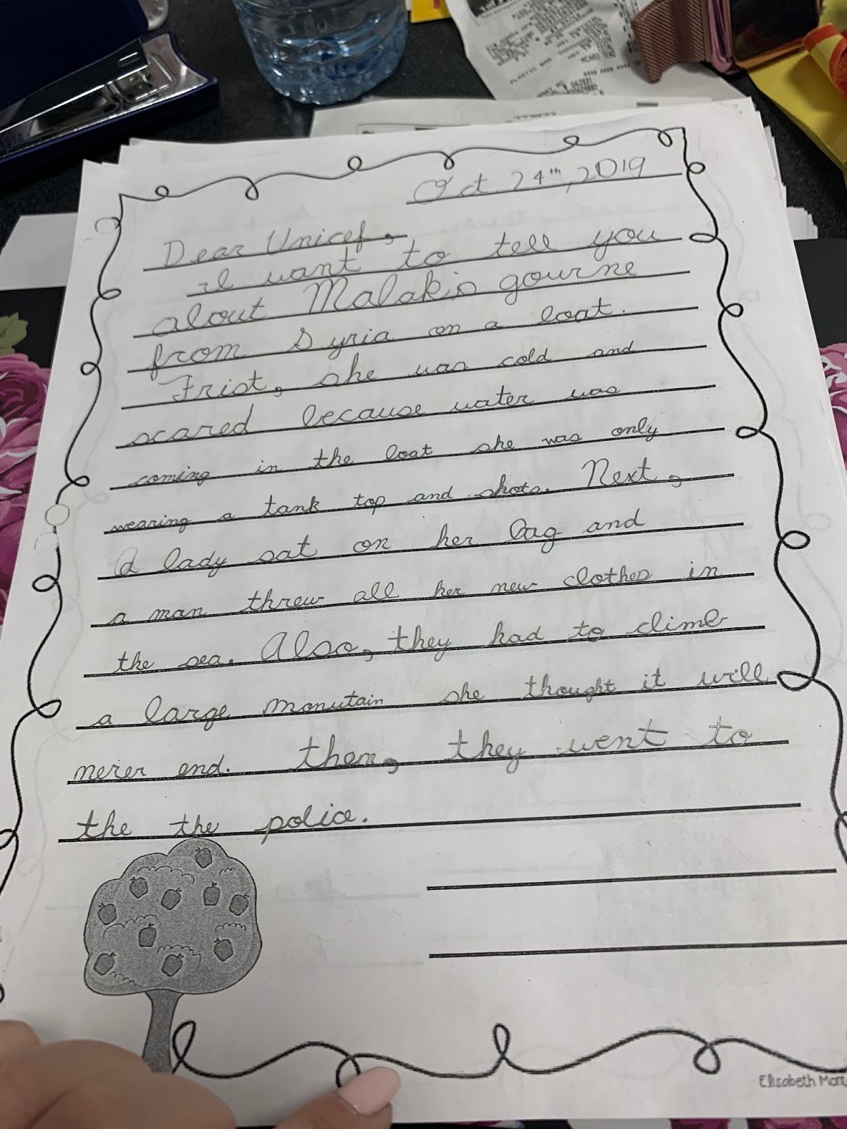 Once complete students were told they were going to write a letter to UNICEF and ask them to help Malak. We described what Unicef is: UNICEF is a program that helps needy children and promotes children's rights around the world. UNICEF is an acronym, or abbreviation, for the program's original name—United Nations International Children's Emergency Fund. ... UNICEF is funded by donations from governments and individuals.